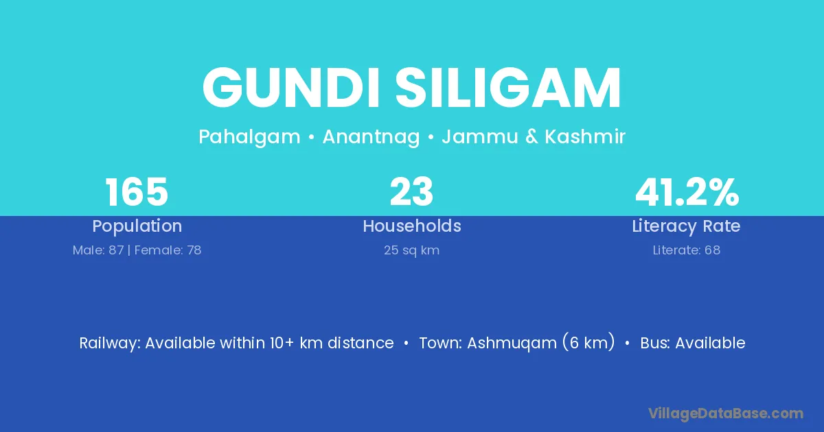 Ashmuqam (6 km) is the nearest town to Gundi Siligam village for major economic activities and is located approximately 6 km away.