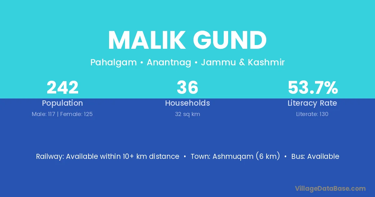 Ashmuqam (6 km) is the nearest town to Malik Gund village for major economic activities and is located approximately 6 km away.