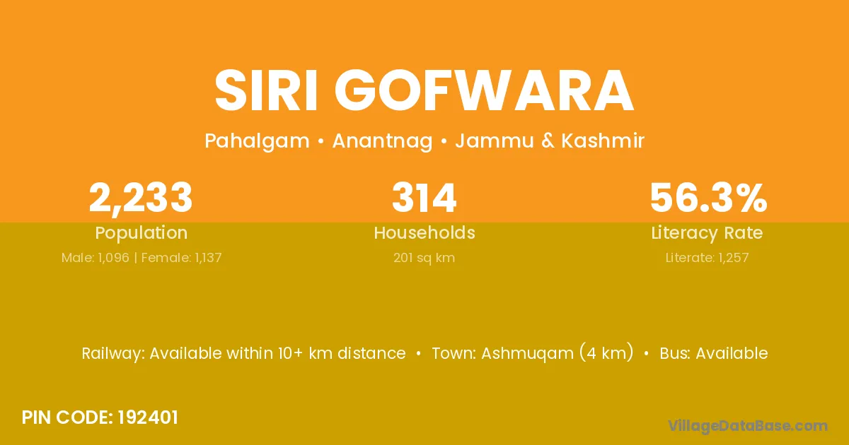 Ashmuqam (4 km) is the nearest town to Siri Gofwara village for major economic activities and is located approximately 4 km away.