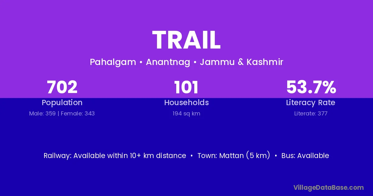 The literacy rate of Trail village is 53.70%. Male literacy stands at 67.13% and female literacy at 39.65%.