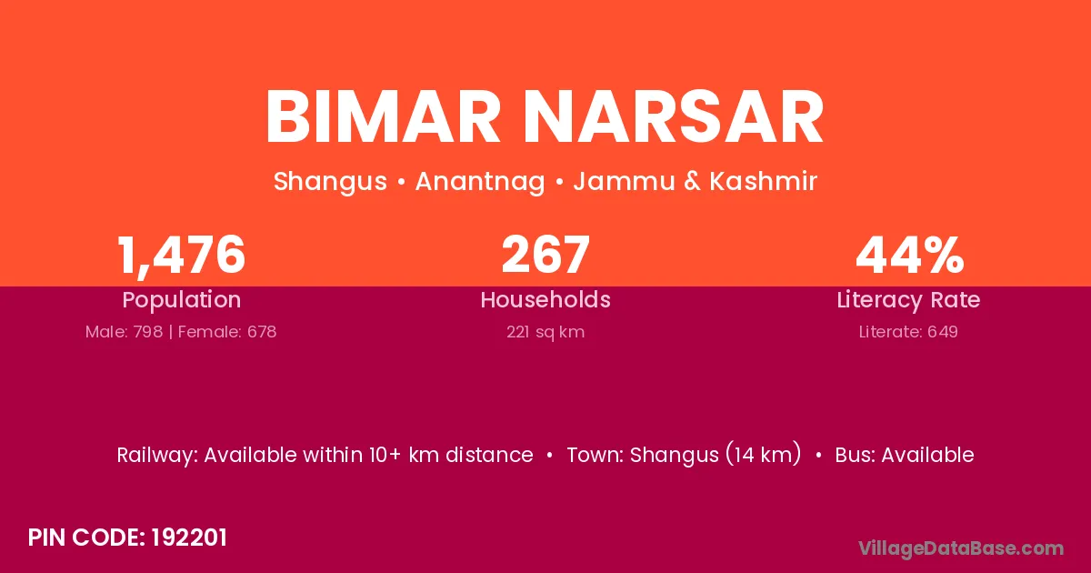 Shangus (14 km) is the nearest town to Bimar Narsar village for major economic activities and is located approximately 14 km away.