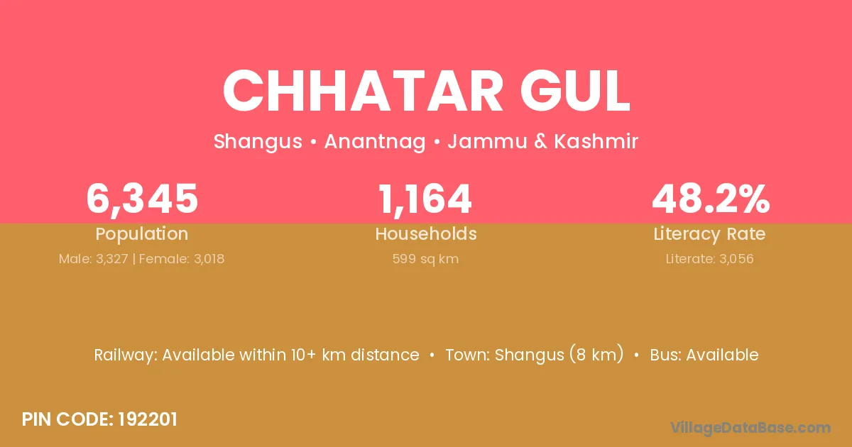 Chhatar Gul village has a total population of 6,345 people, of which 3,327 are males and 3,018 are females.