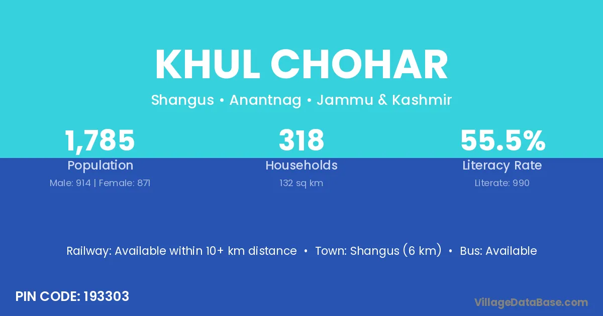 Shangus (6 km) is the nearest town to Khul Chohar village for major economic activities and is located approximately 6 km away.
