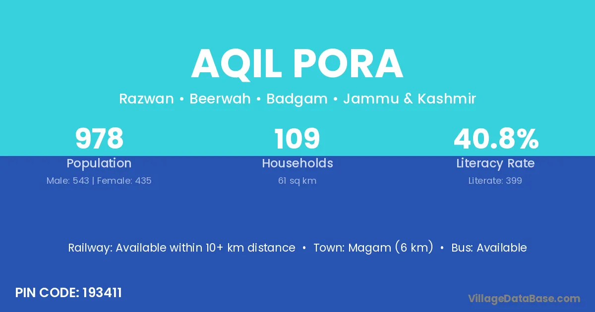 Magam (6 km) is the nearest town to Aqil Pora village for major economic activities and is located approximately 6 km away.