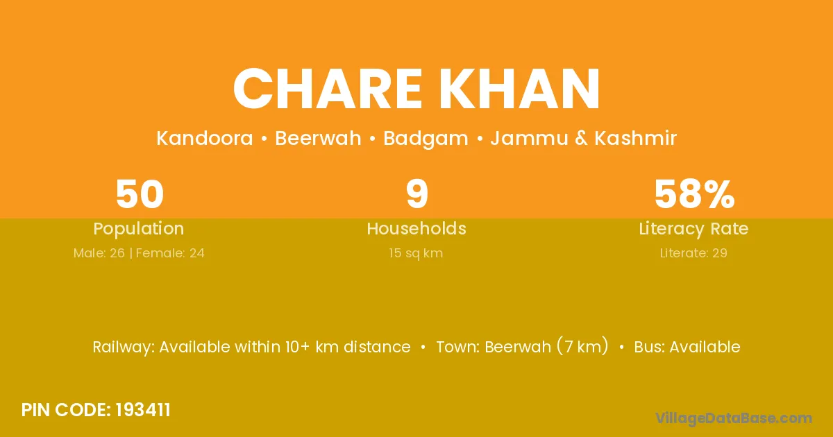 Beerwah (7 km) is the nearest town to Chare Khan village for major economic activities and is located approximately 7 km away.