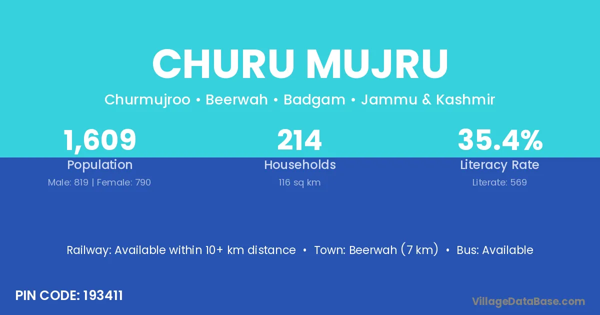 Beerwah (7 km) is the nearest town to Churu Mujru village for major economic activities and is located approximately 7 km away.