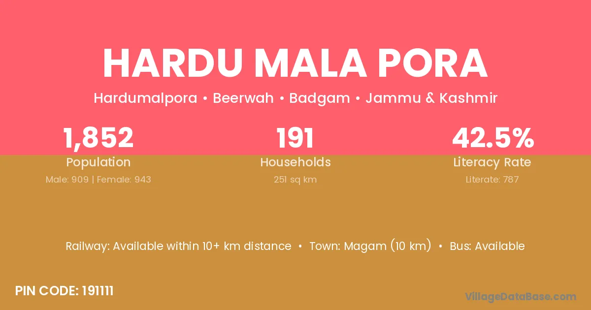 Magam (10 km) is the nearest town to Hardu Mala Pora village for major economic activities and is located approximately 10 km away.