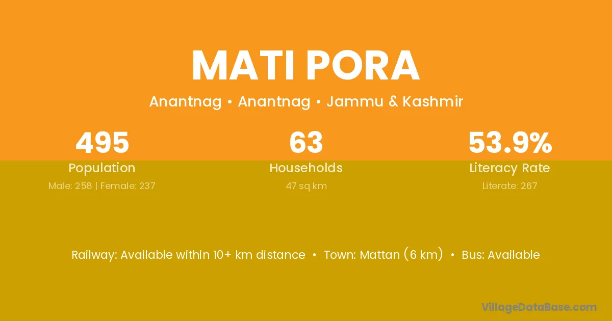 The literacy rate of Mati Pora village is 42.34%. Male literacy stands at 46.74% and female literacy at 37.71%.