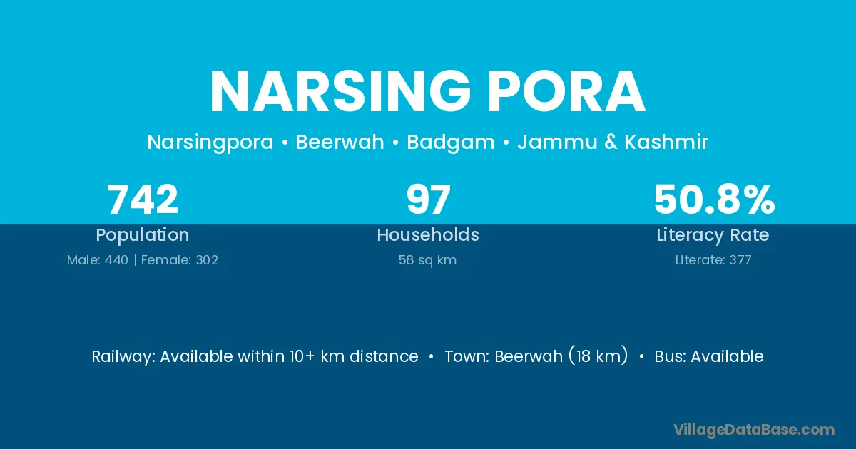 Beerwah (18 km) is the nearest town to Narsing Pora village for major economic activities and is located approximately 18 km away.