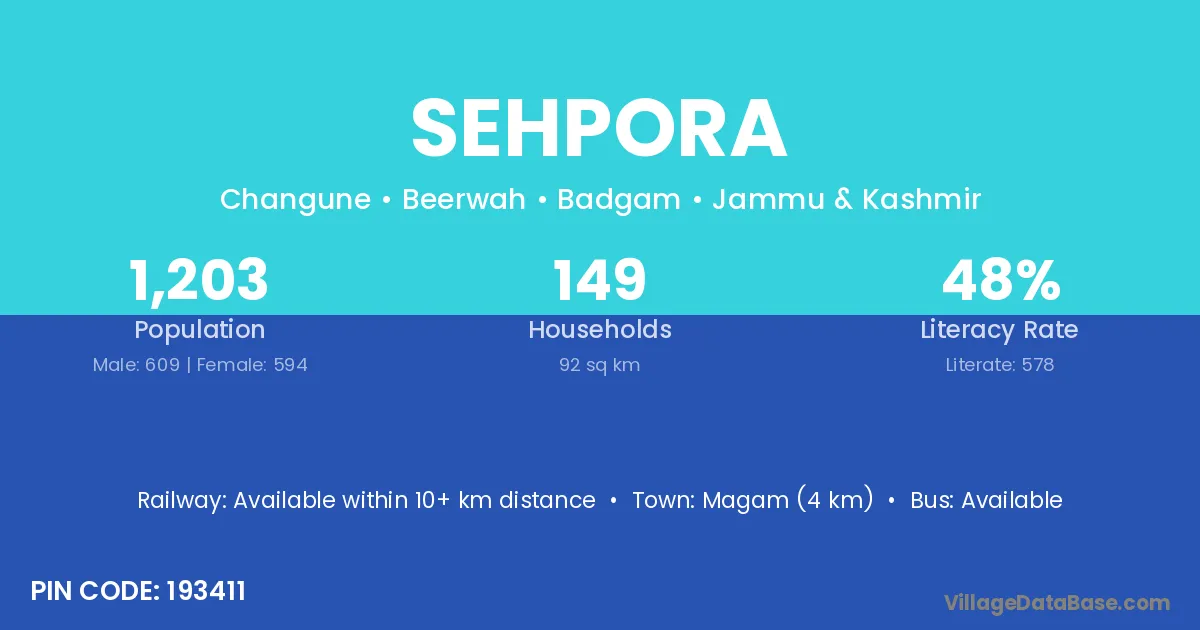 Sehpora village has a total population of 1,203 people, of which 609 are males and 594 are females.