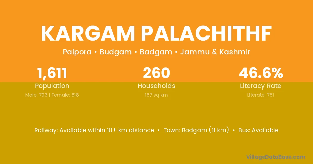 Badgam (11 km) is the nearest town to Kargam Palachithf village for major economic activities and is located approximately 11 km away.