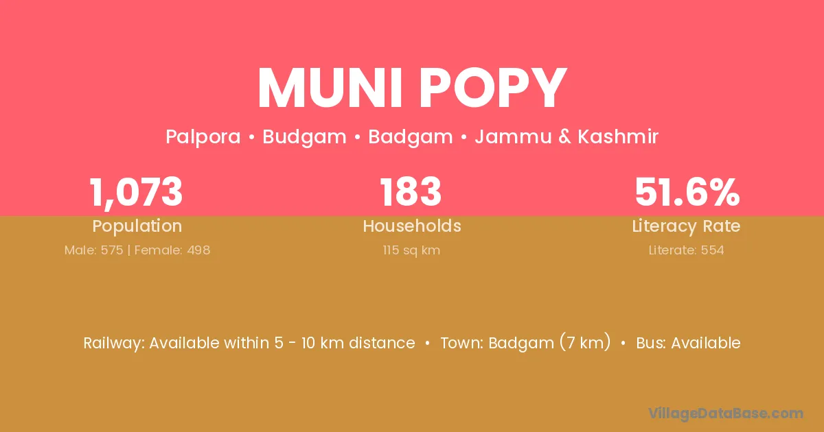 Badgam (7 km) is the nearest town to Muni Popy village for major economic activities and is located approximately 7 km away.