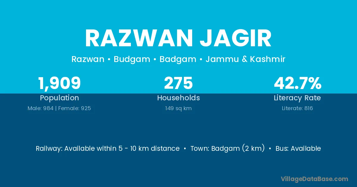 Badgam (2 km) is the nearest town to Razwan Jagir village for major economic activities and is located approximately 2 km away.