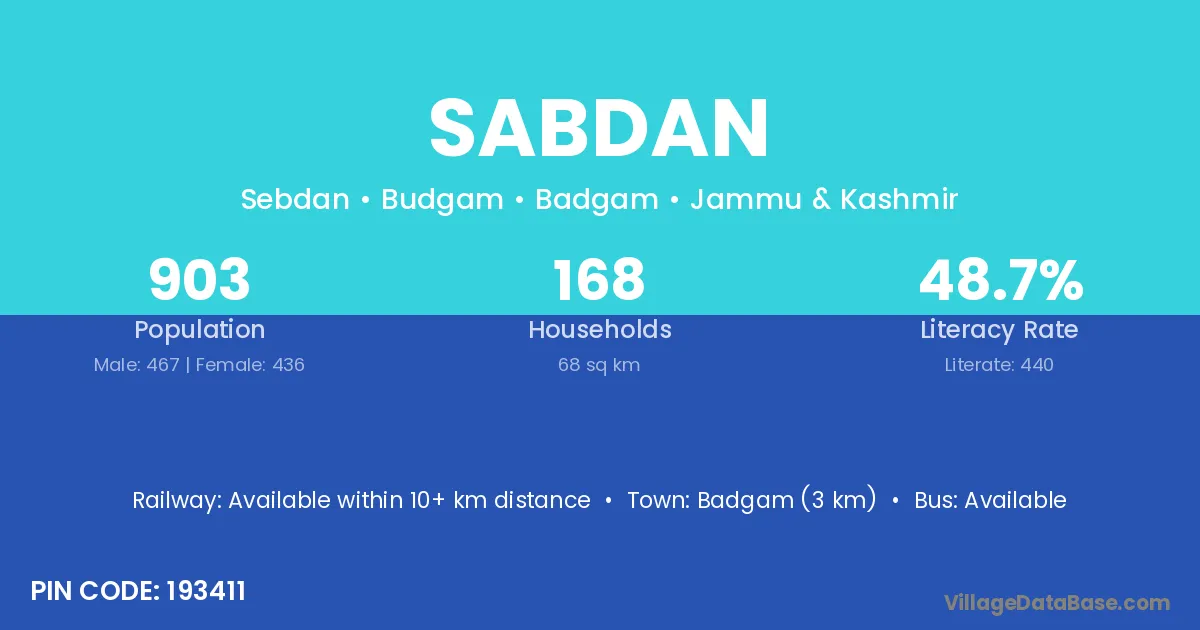 Badgam (3 km) is the nearest town to Sabdan village for major economic activities and is located approximately 3 km away.