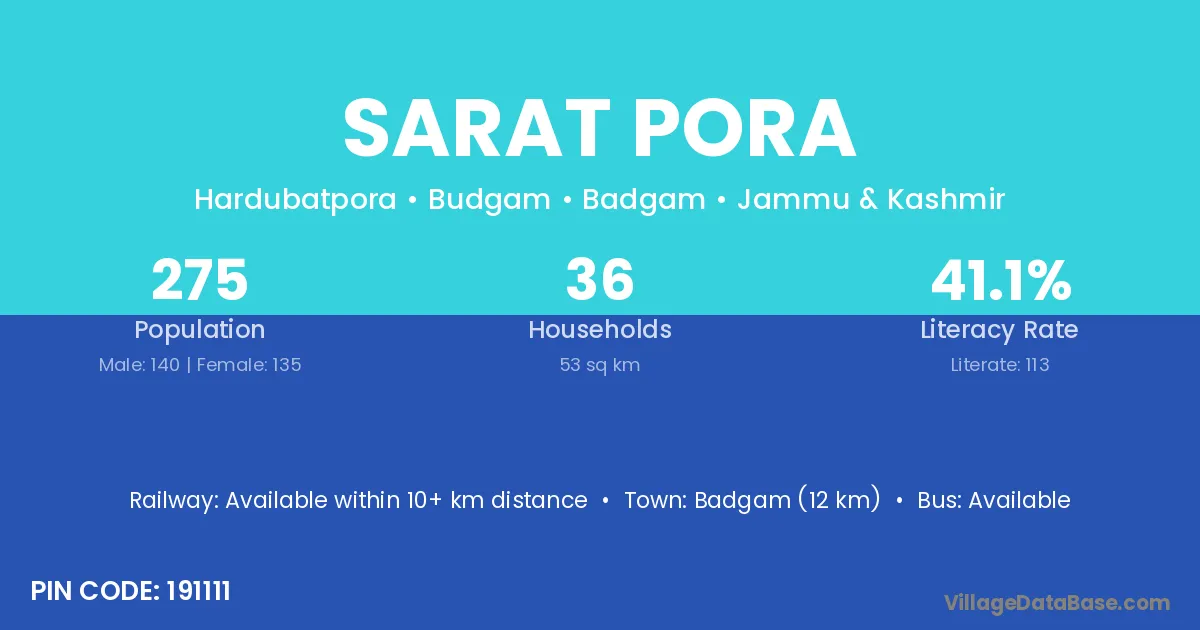 Badgam (12 km) is the nearest town to Sarat Pora village for major economic activities and is located approximately 12 km away.