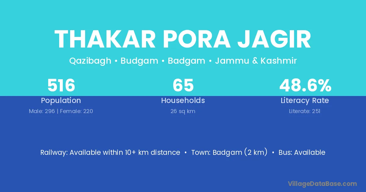 Thakar Pora Jagir village has a total population of 516 people, of which 296 are males and 220 are females.