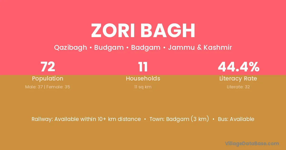 Badgam (3 km) is the nearest town to Zori Bagh village for major economic activities and is located approximately 3 km away.