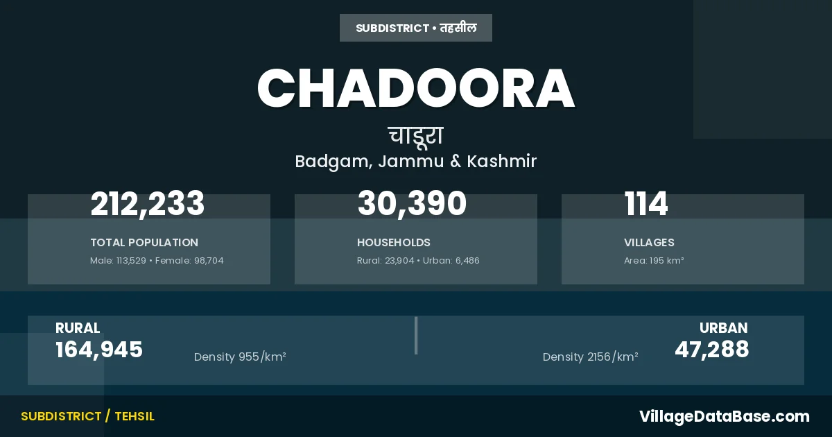 According to the 2011 census The total area of Chadoora Tehsil is 195 km², with a population of 212233 people. The population density is 1,090 inhabitants per square kilometre, and there are approximately 30390 houses in the sub district.