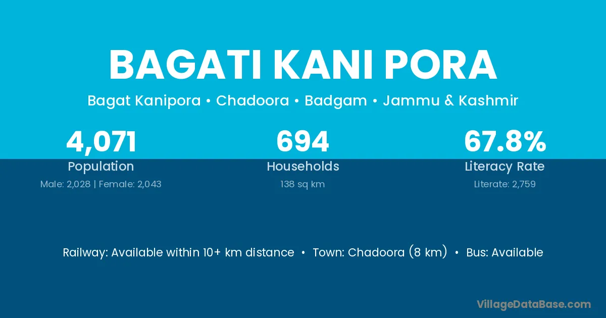 Bagati Kani Pora village has a total population of 4,071 people, of which 2,028 are males and 2,043 are females.