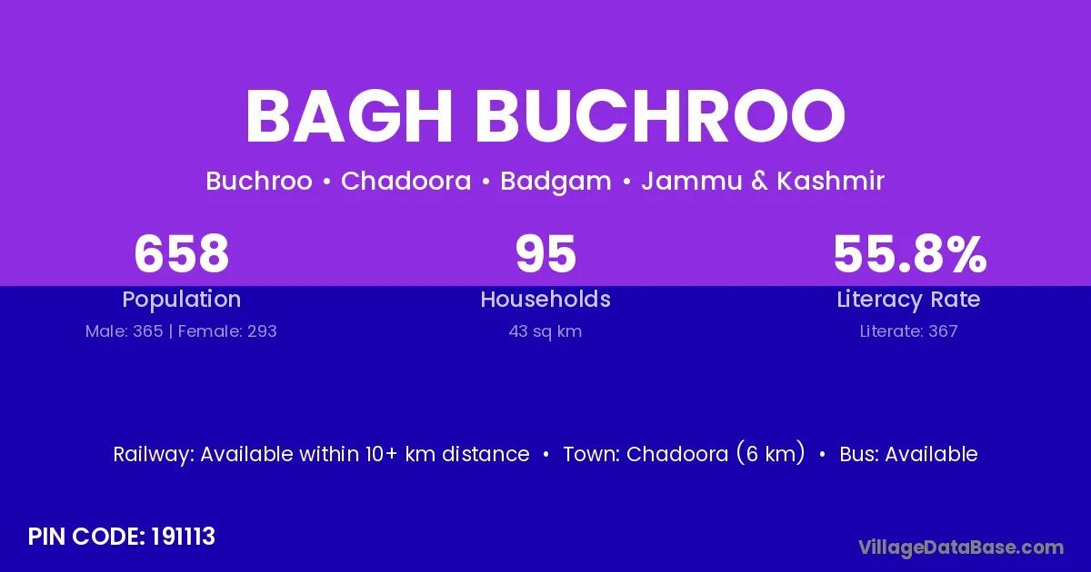 Bagh Buchroo village has a total population of 658 people, of which 365 are males and 293 are females.