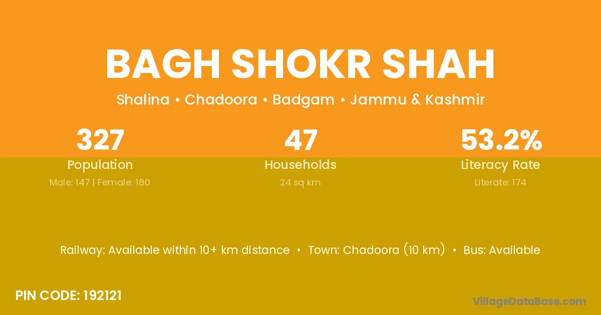 Chadoora (10 km) is the nearest town to Bagh Shokr Shah village for major economic activities and is located approximately 10 km away.