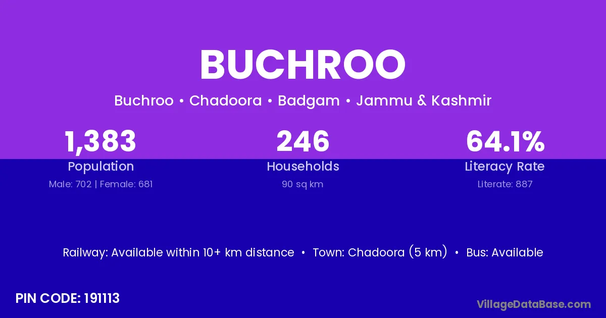 Chadoora (5 km) is the nearest town to Buchroo village for major economic activities and is located approximately 5 km away.