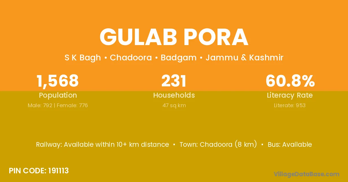 Chadoora (8 km) is the nearest town to Gulab Pora village for major economic activities and is located approximately 8 km away.