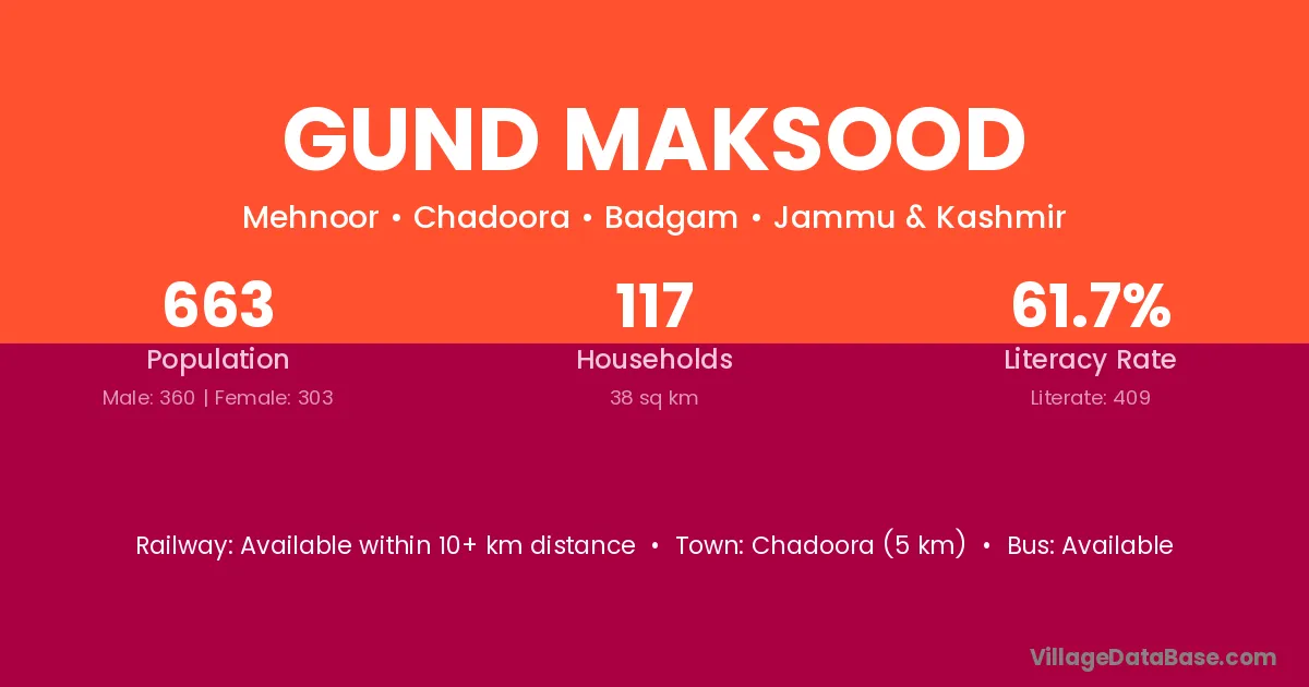 Chadoora (5 km) is the nearest town to Gund Maksood village for major economic activities and is located approximately 5 km away.