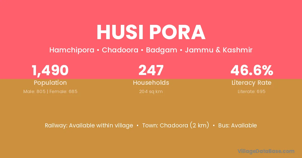Chadoora (2 km) is the nearest town to Husi Pora village for major economic activities and is located approximately 2 km away.