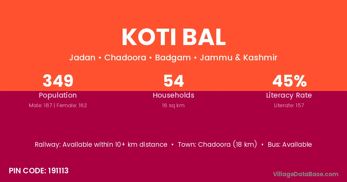 Chadoora (18 km) is the nearest town to Koti Bal village for major economic activities and is located approximately 18 km away.
