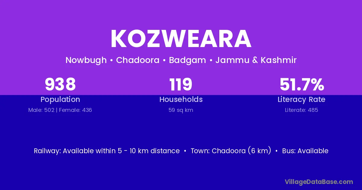 Kozweara village has a total population of 938 people, of which 502 are males and 436 are females.
