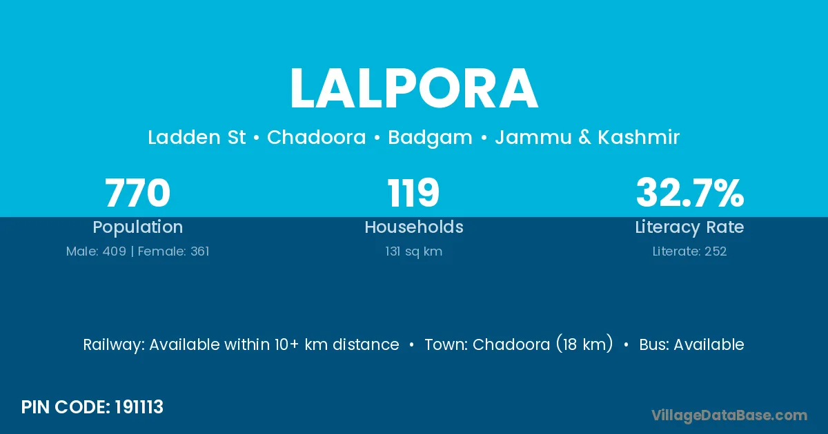 Chadoora (18 km) is the nearest town to Lalpora village for major economic activities and is located approximately 18 km away.