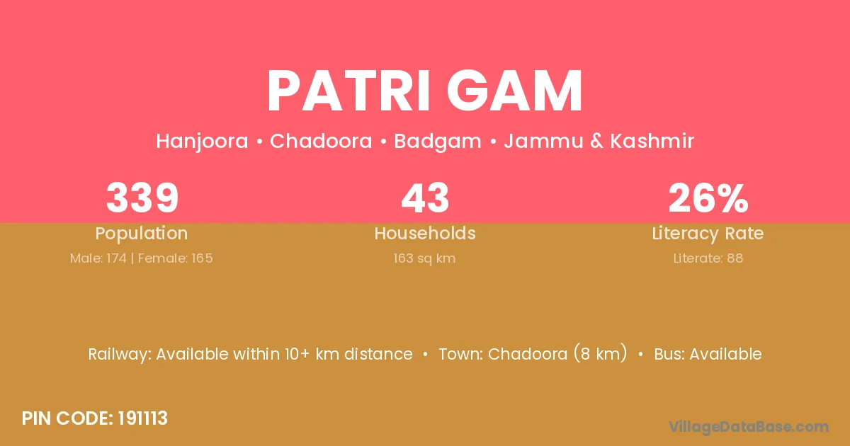 Chadoora (8 km) is the nearest town to Patri Gam village for major economic activities and is located approximately 8 km away.