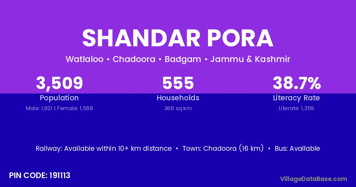 Chadoora (16 km) is the nearest town to Shandar Pora village for major economic activities and is located approximately 16 km away.