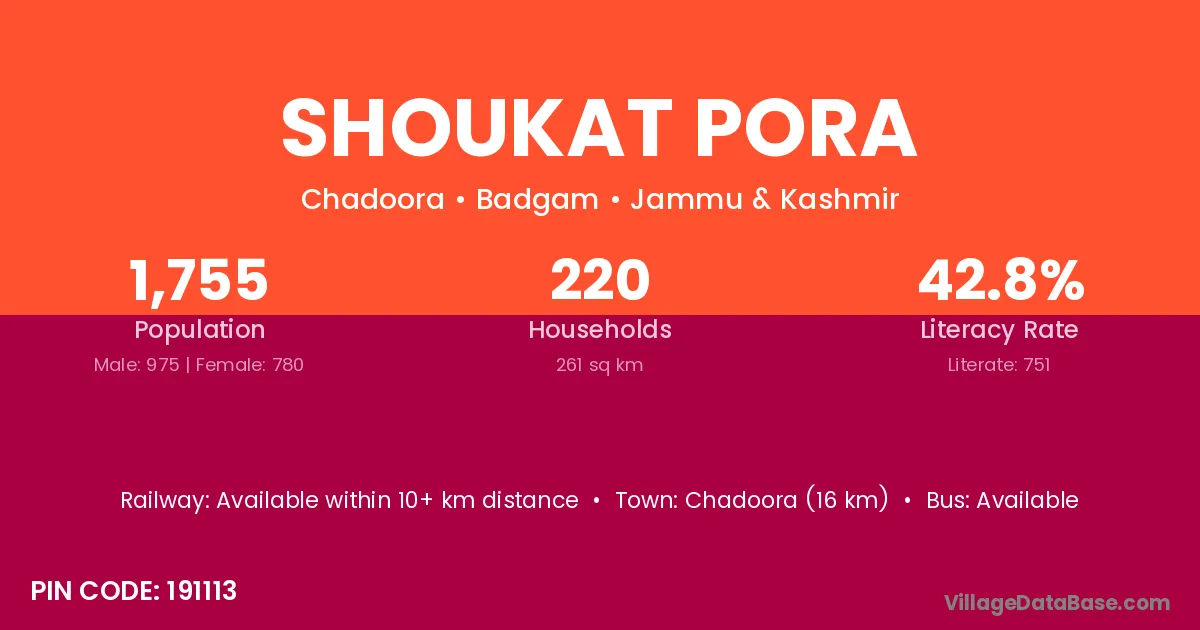Chadoora (16 km) is the nearest town to Shoukat Pora village for major economic activities and is located approximately 16 km away.