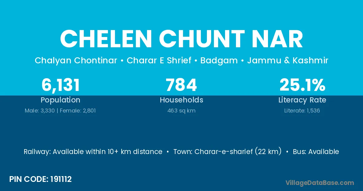 Charar-e-sharief (22 km) is the nearest town to Chelen Chunt Nar village for major economic activities and is located approximately 22 km away.