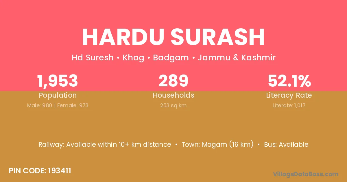 Hardu Surash village has a total population of 1,953 people, of which 980 are males and 973 are females.