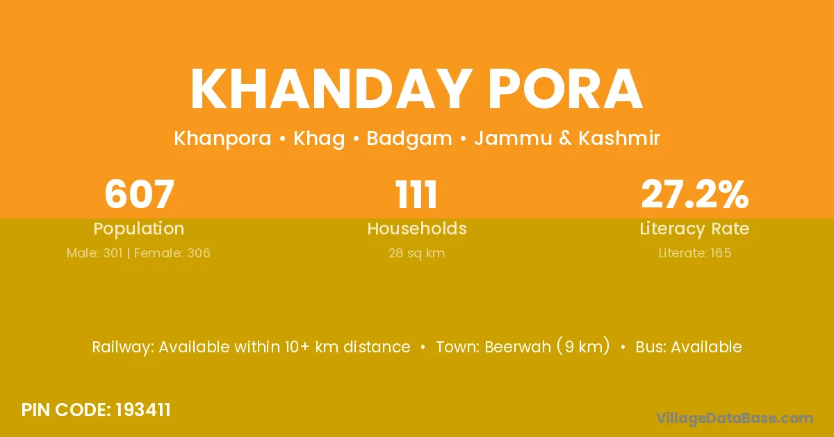 Khanday Pora village has a total population of 607 people, of which 301 are males and 306 are females.