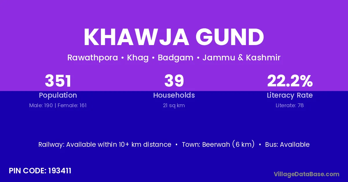 Beerwah (6 km) is the nearest town to Khawja Gund village for major economic activities and is located approximately 6 km away.