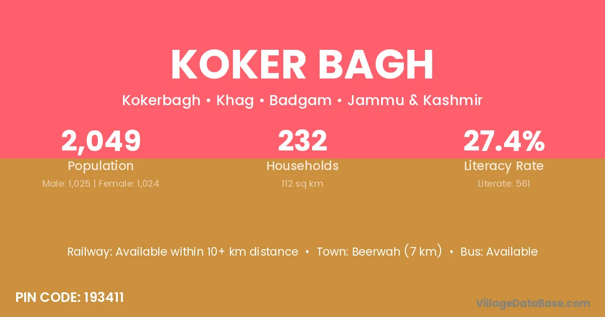 Beerwah (7 km) is the nearest town to Koker Bagh village for major economic activities and is located approximately 7 km away.