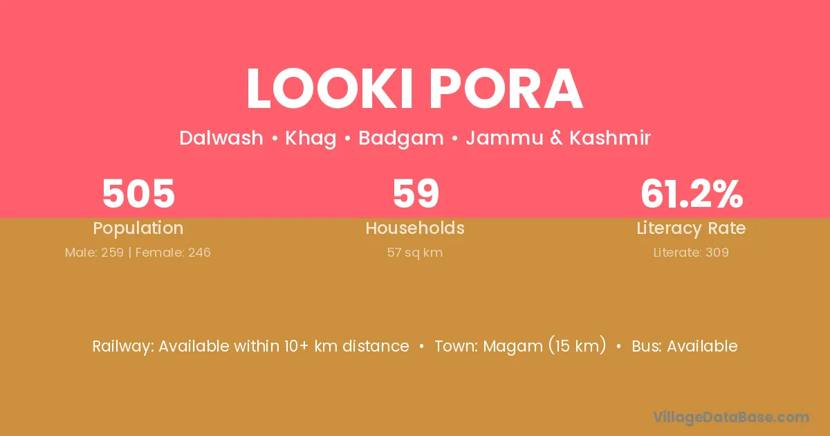 Magam (15 km) is the nearest town to Looki Pora village for major economic activities and is located approximately 15 km away.