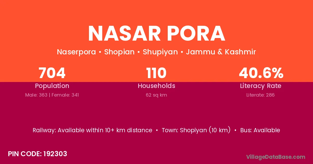 Magam (11 km) is the nearest town to Nasar Pora village for major economic activities and is located approximately 11 km away.