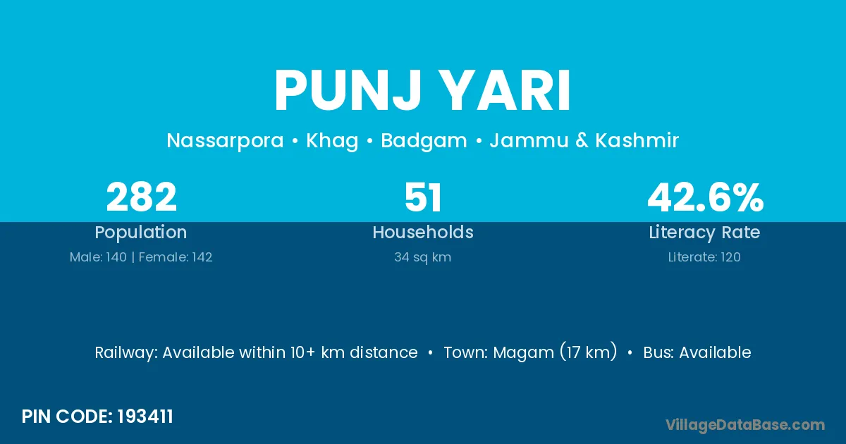 Magam (17 km) is the nearest town to Punj Yari village for major economic activities and is located approximately 17 km away.