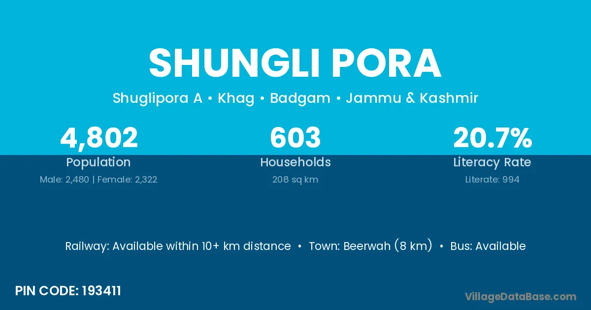 Beerwah (8 km) is the nearest town to Shungli Pora village for major economic activities and is located approximately 8 km away.