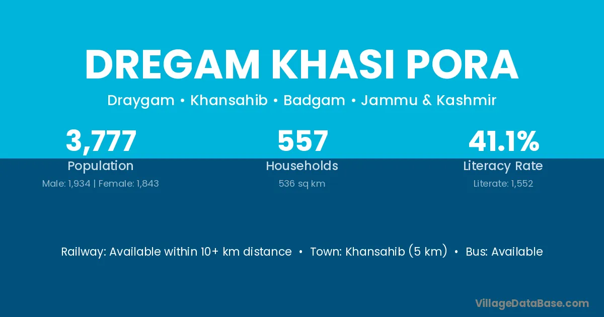 Khansahib (5 km) is the nearest town to Dregam Khasi Pora village for major economic activities and is located approximately 5 km away.
