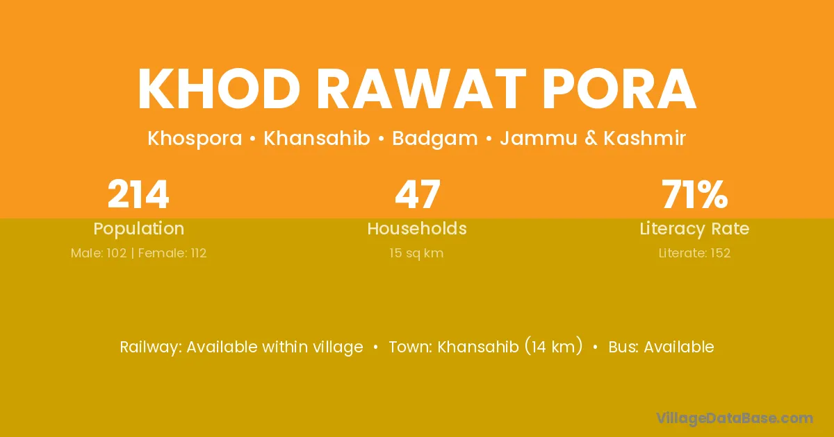 Khod Rawat Pora village has a total population of 214 people, of which 102 are males and 112 are females.