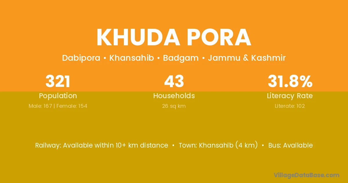 Khuda Pora village has a total population of 321 people, of which 167 are males and 154 are females.