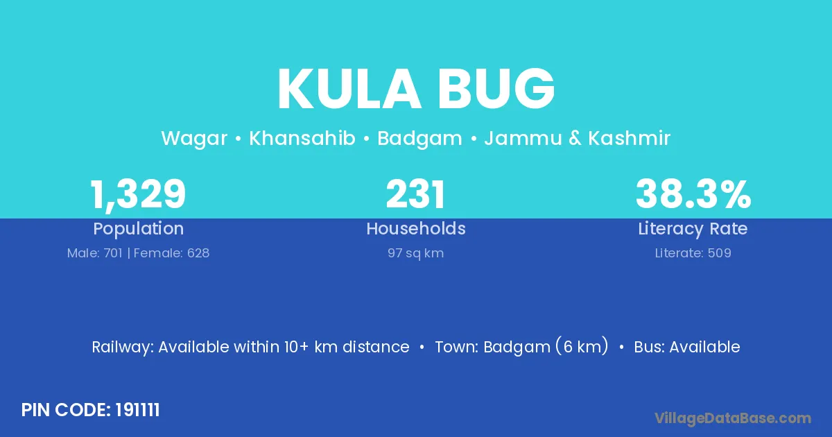 Badgam (6 km) is the nearest town to Kula Bug village for major economic activities and is located approximately 6 km away.
