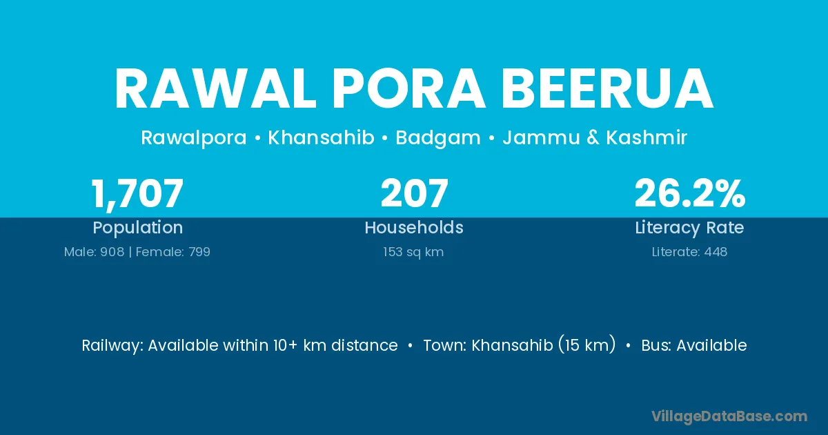 Khansahib (15 km) is the nearest town to Rawal Pora Beerua village for major economic activities and is located approximately 15 km away.