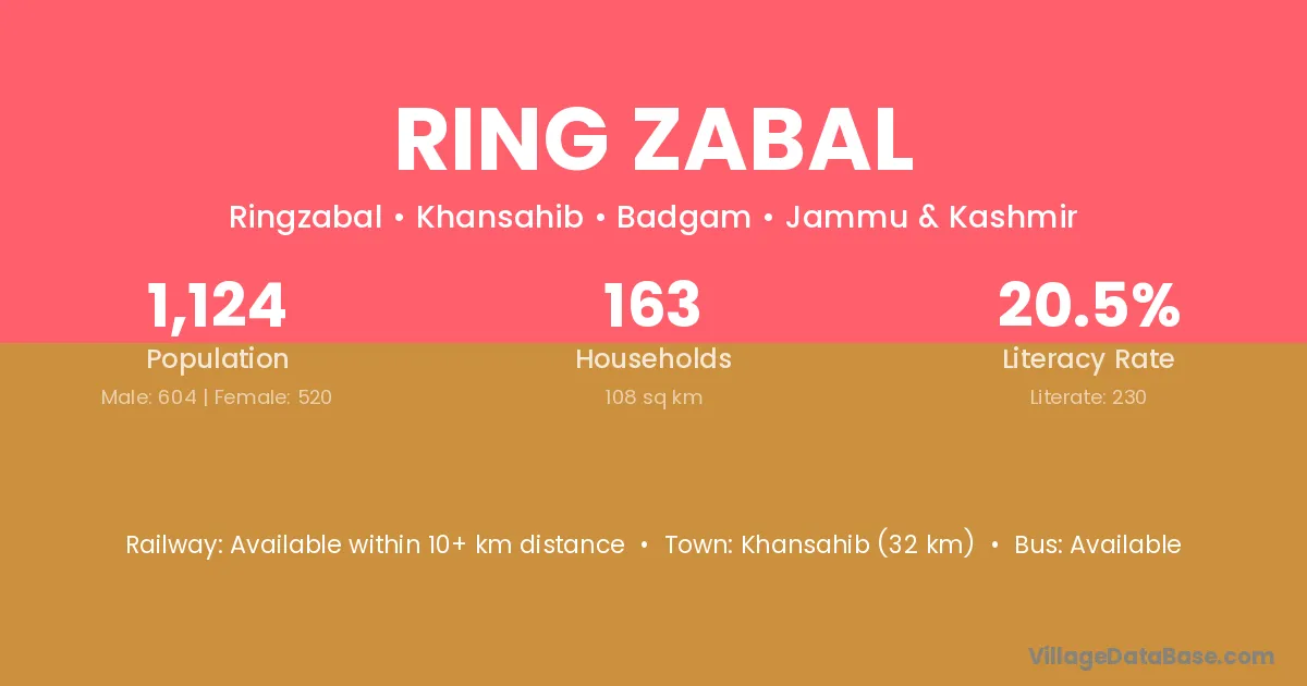 Ring Zabal village has a total population of 1,124 people, of which 604 are males and 520 are females.